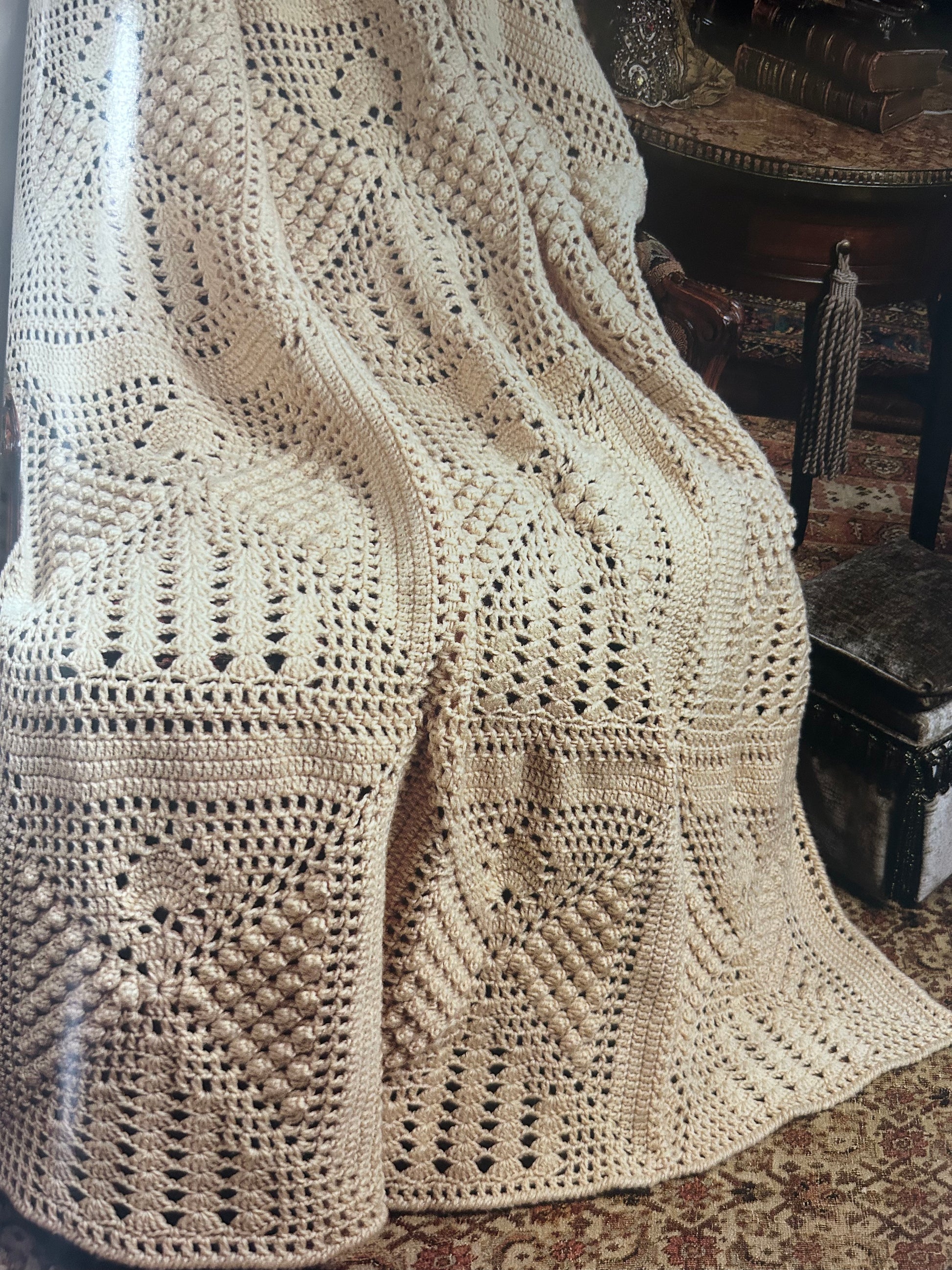 This divine afghan makes a wonderful holiday wrap. (Design by: Gail Tanquary) Approximate finished size in medium yarn is 46 inches x 61 inches. Thinner yarns will result in a smaller fabric by approximately 1 to 2 inches per foot. |
