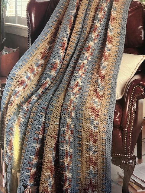 The warm, subtle hues in this masculine throw are spiced with variegated yarn in shades of cinnamon. (Design by: Marion Miedema) Approximate finished size in medium yarn is 49 inches x 65 inches. Thinner yarns will result in a smaller fabric by approximately 1 to 2 inches per foot. |