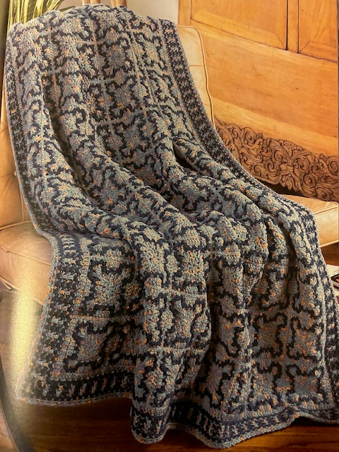 On a background of variegated yarn, a contrasting colour creates an eye-catching pattern on this extravagant afghan. Dignified edging adds a beautiful finish. (Design by: Anne Halliday) Approximate finished size in medium yarn is 49 inches x 68 inches. Thinner yarns will result in a smaller fabric by approximately 1 to 2 inches per foot. |