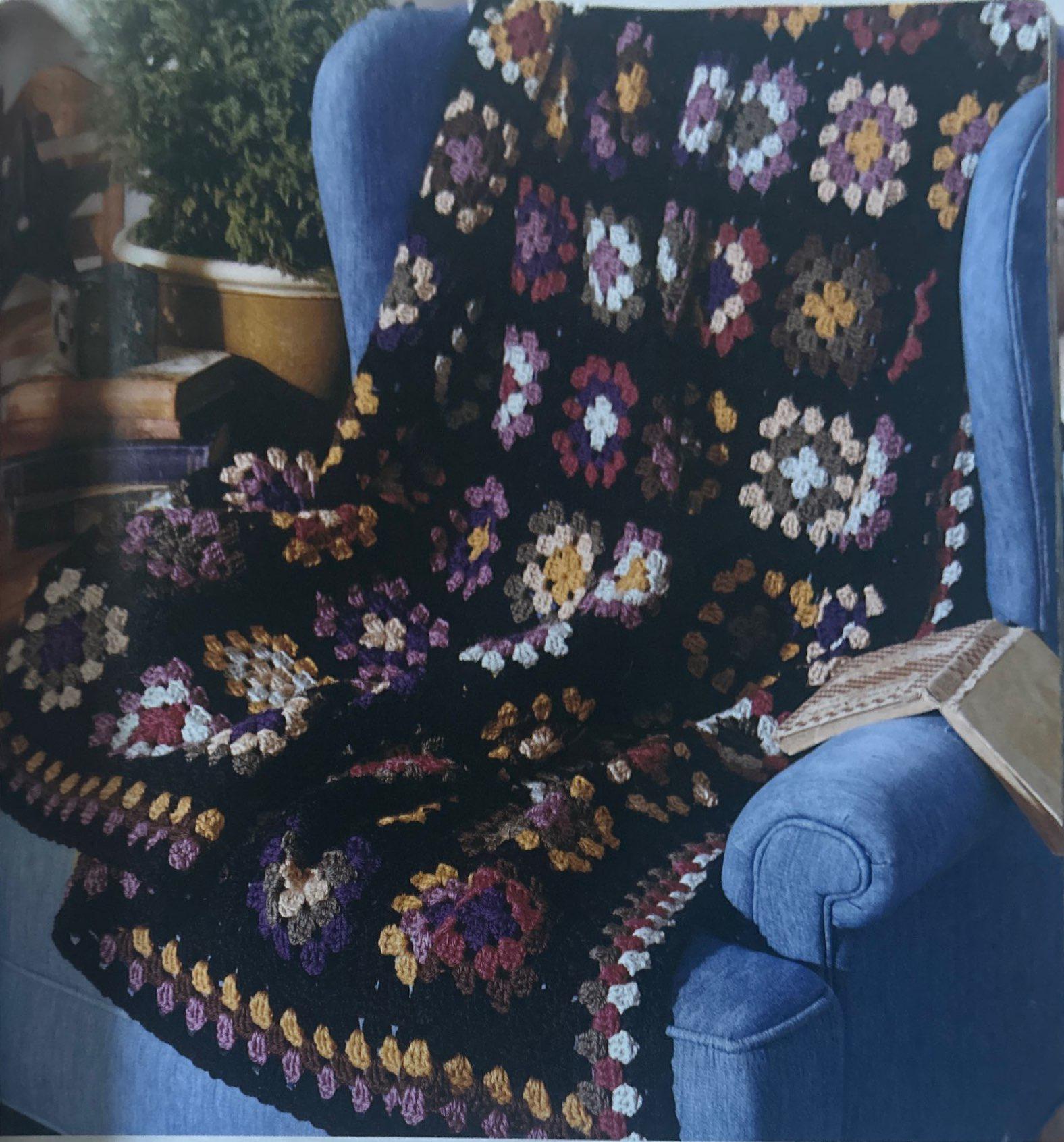 Granny squares in a potpourri of colours offer a lovely fall remembrance. (Design by: Anne Halliday) Approximate finished size in medium yarn is 48.5 inches x 67.5 inches. Thinner yarns will result in a smaller fabric by approximately 1 to 2 inches per foot. |