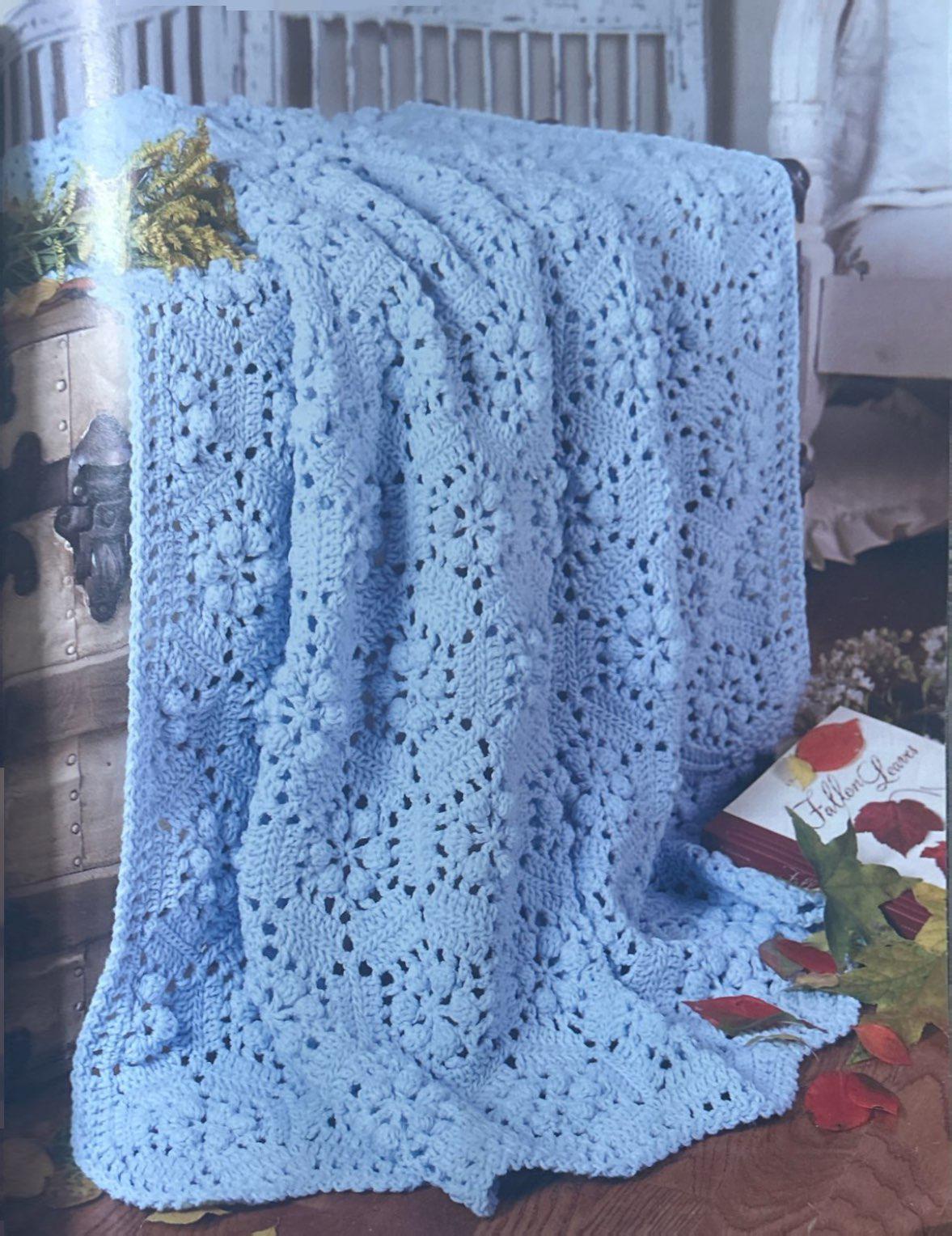 A visit from Jack Frost turns the colourful autumn landscape into a sparkling icy-blue wonderland. (Design by: Anne Halliday) Approximate finished size in medium yarn is 46 inches x 64 inches. Thinner yarns will result in a smaller fabric by approximately 1 to 2 inches per foot. |