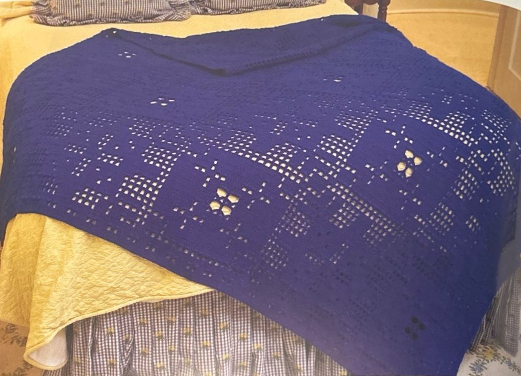 This large and dramatic afghan could also be used as a bedspread. (Design by: Ferosa Harold) Approximate finished size in medium yarn is 70 inches x 83 inches. Thinner yarns will result in a smaller fabric by approximately 1 to 2 inches per foot. |