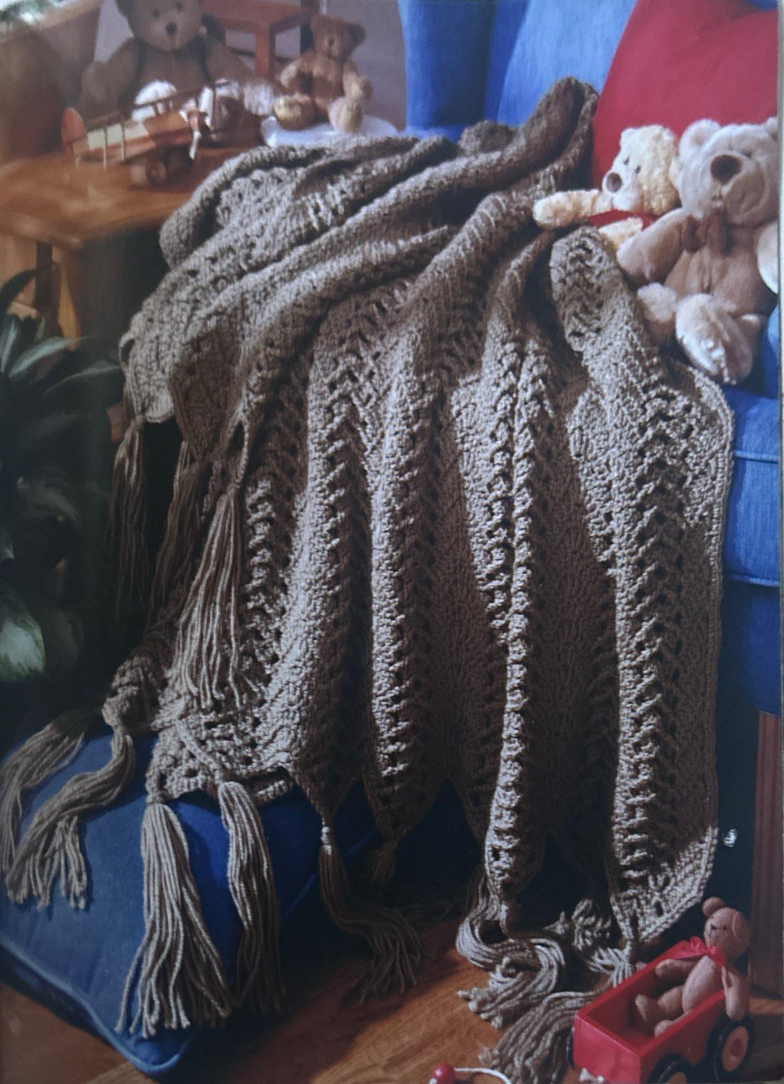 After a long day at work, it's time to unwind with a steaming mug of hot cocoa. (Design by: Tammy Kreimeyer) Approximate finished size in medium yarn is 50 inches x 64.5 inches. Thinner yarns will result in a smaller fabric by approximately 1 to 2 inches per foot. |