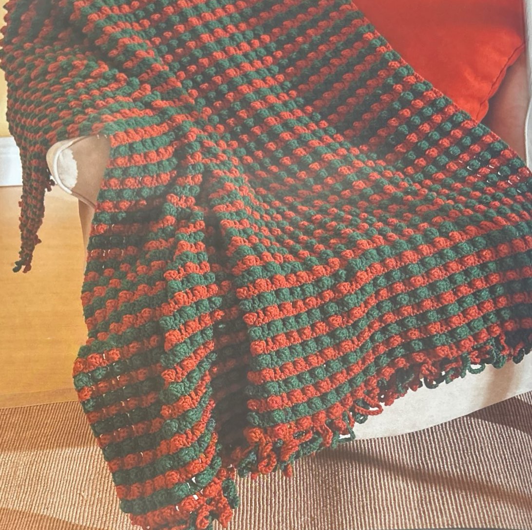 The colours of Christmas are united in this festive afghan to help you send your season's greetings to just about anyone on your list. (Design by: Jean Leinhauser) Approximate finished size in medium yarn is 44 inches x 52 inches. Thinner yarns will result in a smaller fabric by approximately 1 to 2 inches per foot. |
