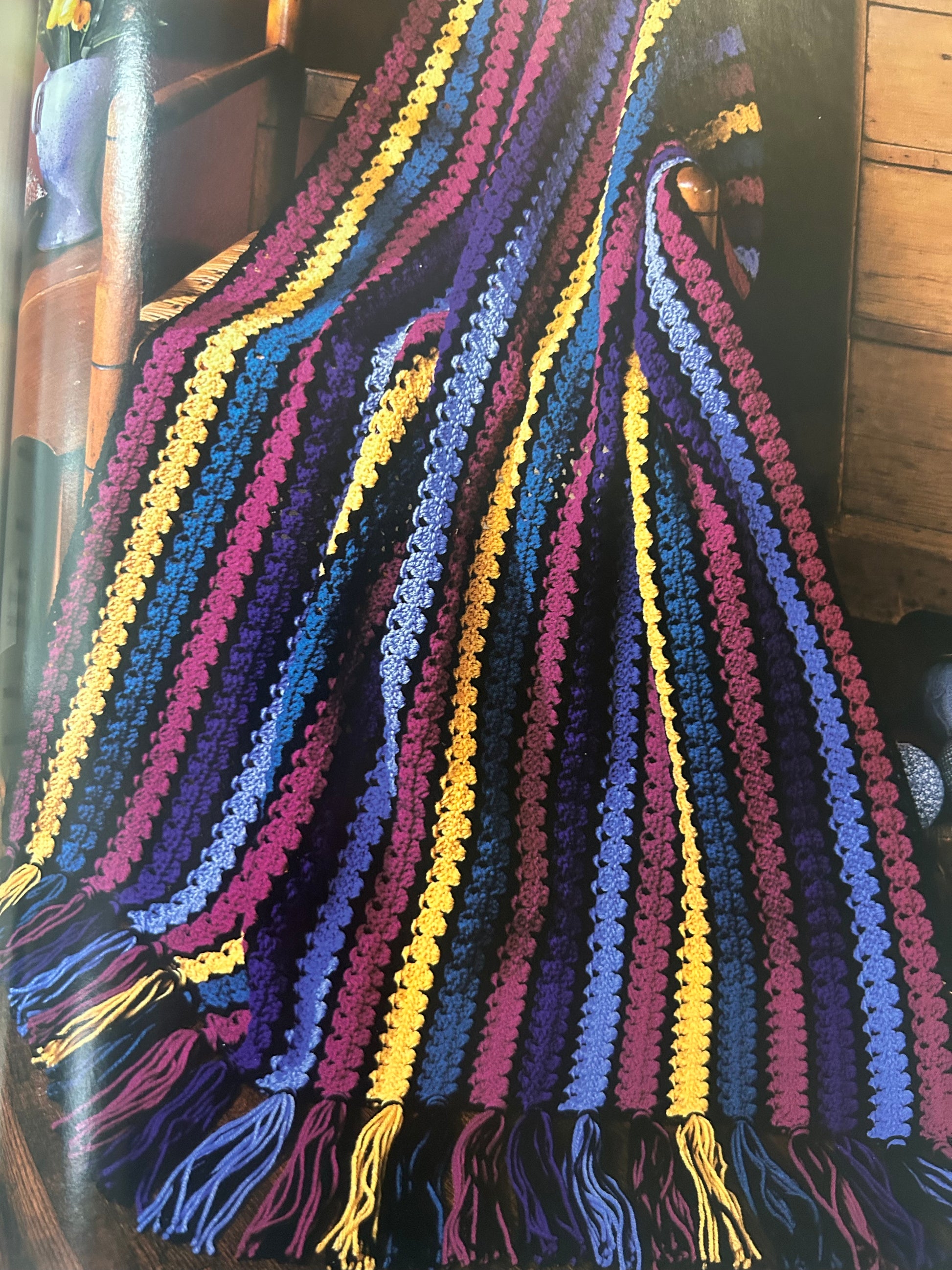 Kids especially enjoy this intriguing afghan with vivid colours. (Design by: Carole Prior) Approximate finished size in medium yarn is 42 inches x 58 inches. Thinner yarns will result in a smaller fabric by approximately 1 to 2 inches per foot. |