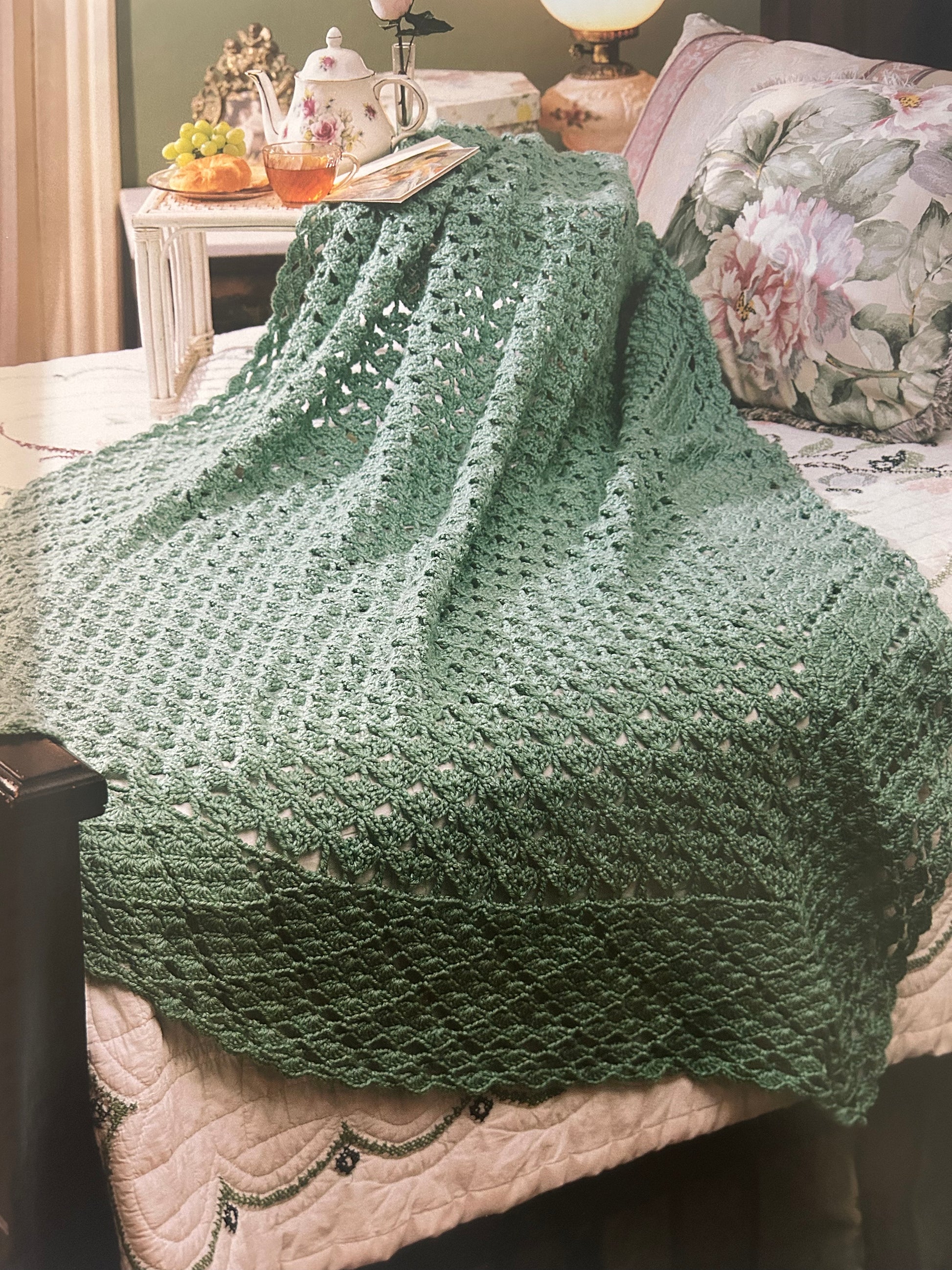 Irish eyes won't be the only ones smiling over this gorgeous afghan that resembles a majestic field of clover. (Design by: Ann Kirtley) Approximate finished size in medium yarn is 48 inches x 68 inches. Thinner yarns will result in a smaller fabric by approximately 1 to 2 inches per foot. |