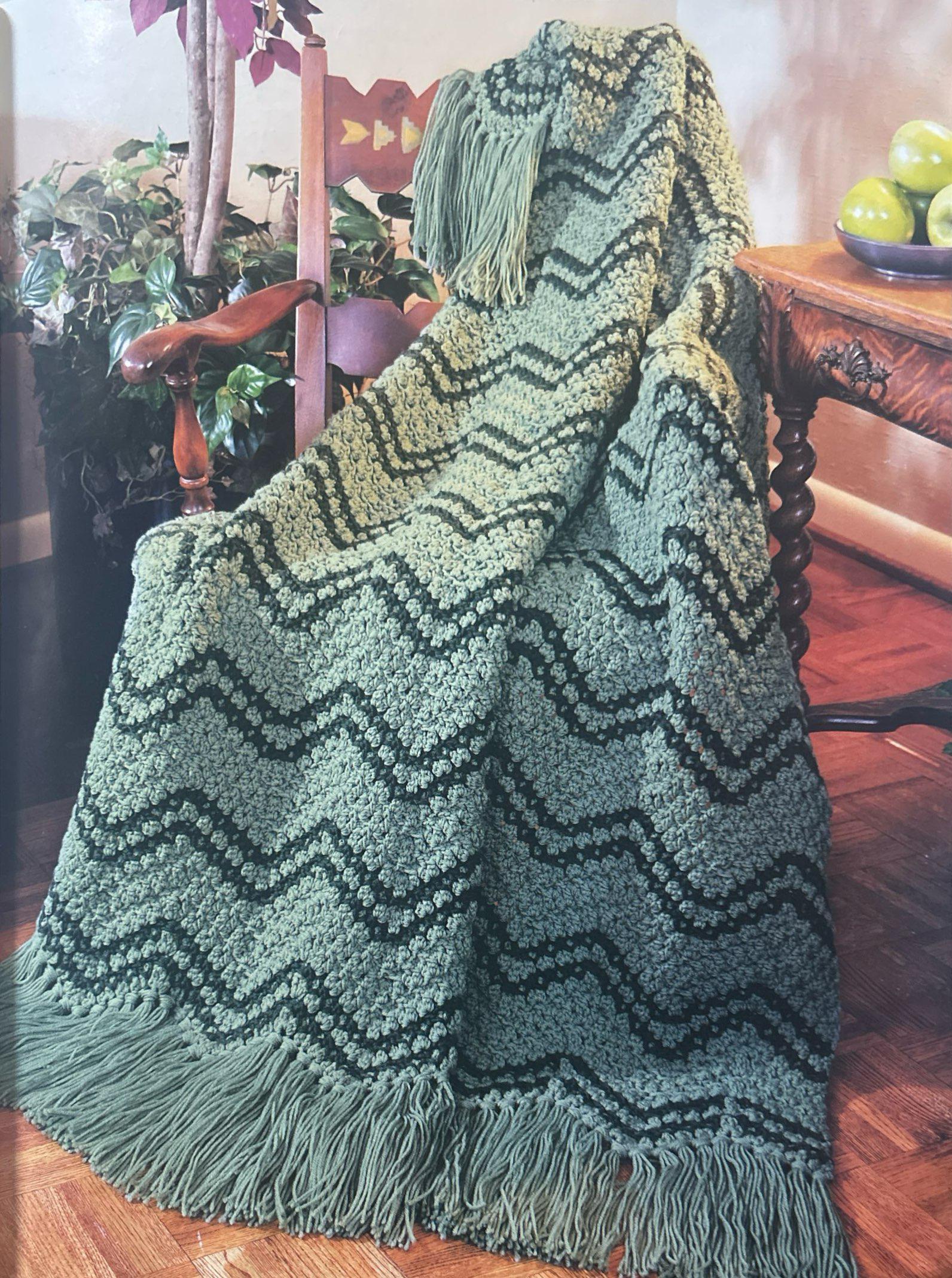 Snuggle up in a sea of green with this tranquil ripple afghan. This contrasting wrap is as calming as a lakeside picnic in early spring. (Design by: Tammy Kreimeyer) Approximate finished size in medium yarn is 52 inches x 65 inches. Thinner yarns will result in a smaller fabric by approximately 1 to 2 inches per foot. |
