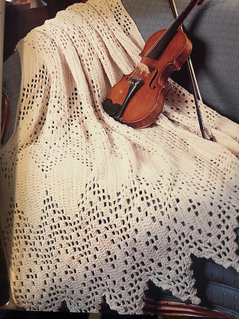 Reminiscent of an elegant era, this throw features a lacy diamond pattern worked in filet crochet. (Design by: Terry Kimbrough) Approximate finished size in medium yarn is 45 inches x 65 inches. Thinner yarns will result in a smaller fabric by approximately 1 to 2 inches per foot.  |