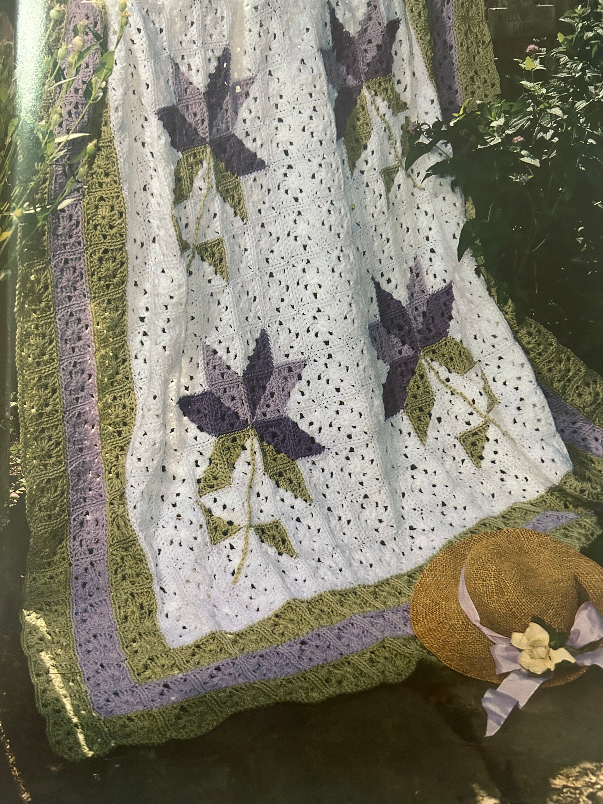 Springtime will stand still with this patchwork of blossoming violas. (Design by: Martha Brooks Stein) Approximate finished size in medium yarn is 60.5 inches x 75.5 inches. Thinner yarns will result in a smaller fabric by approximately 1 to 2 inches per foot.  |