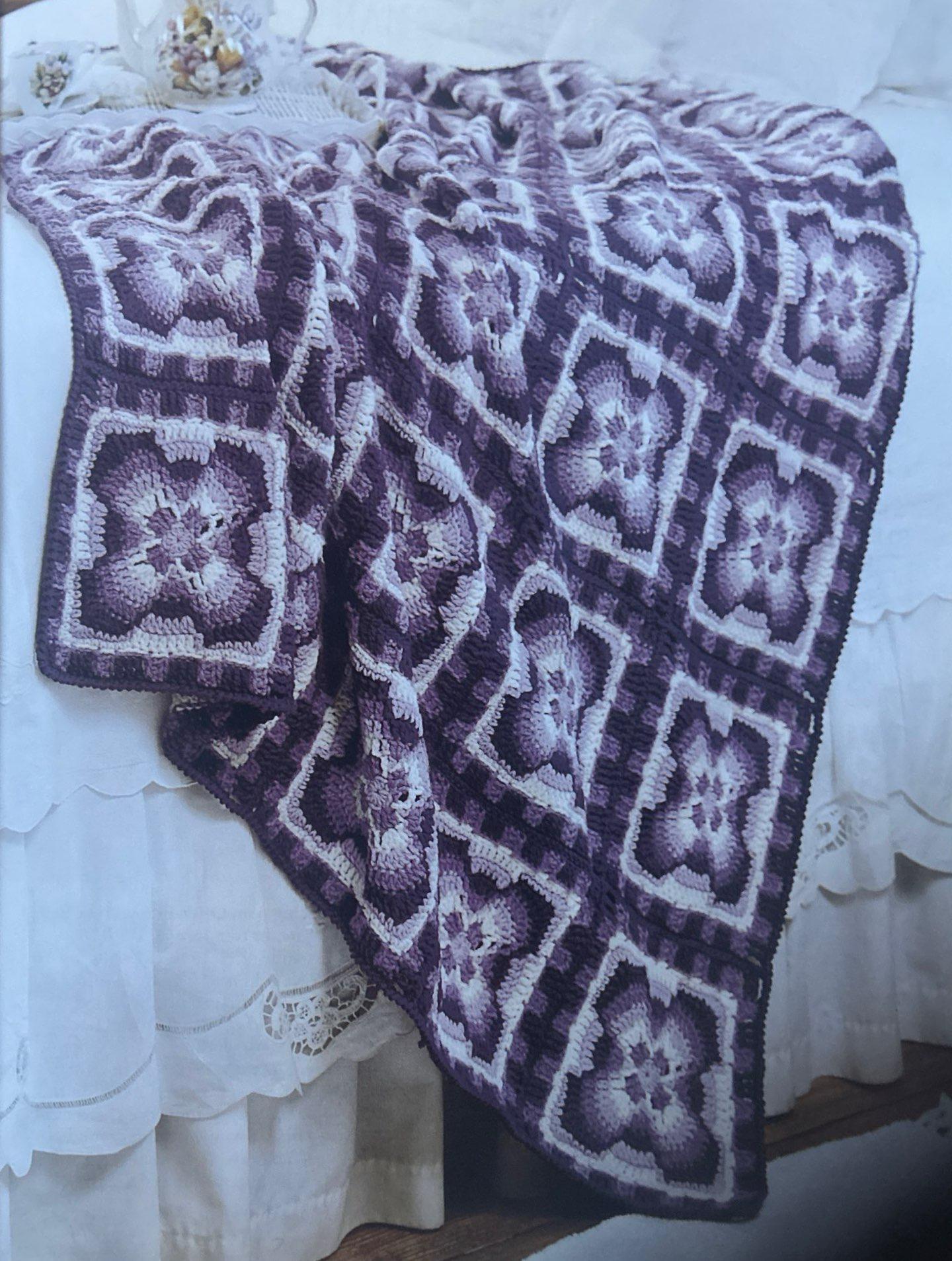 Drift away to a fantasyland of whimsy and dreams with this delicate windmill throw. Three shades of lavender make this reverie a dainty vision. (Design by: Rosalie DeVries) Approximate finished size in medium yarn is 45 inches x 63 inches. Thinner yarns will result in a smaller fabric by approximately 1 to 2 inches per foot.  |